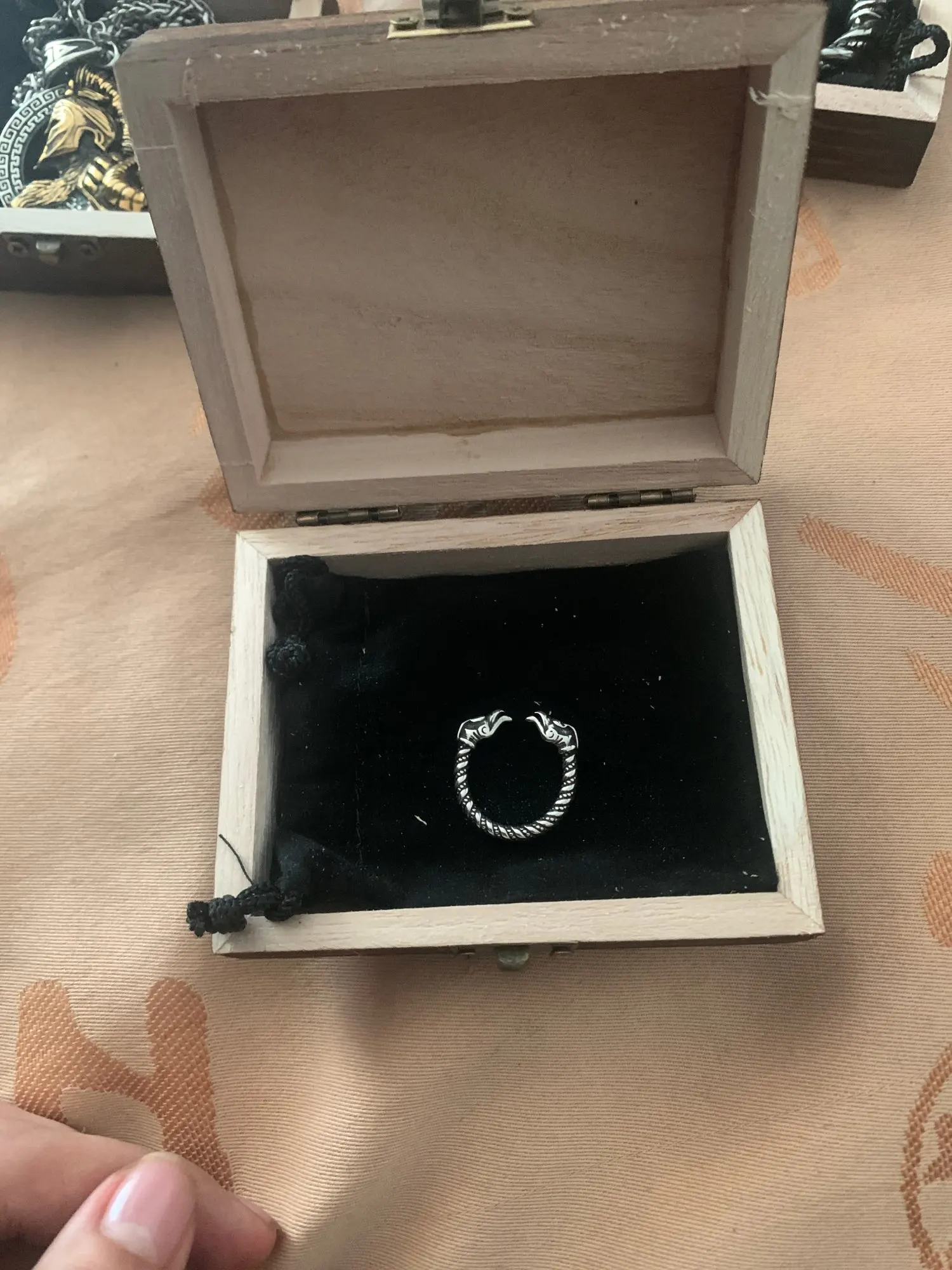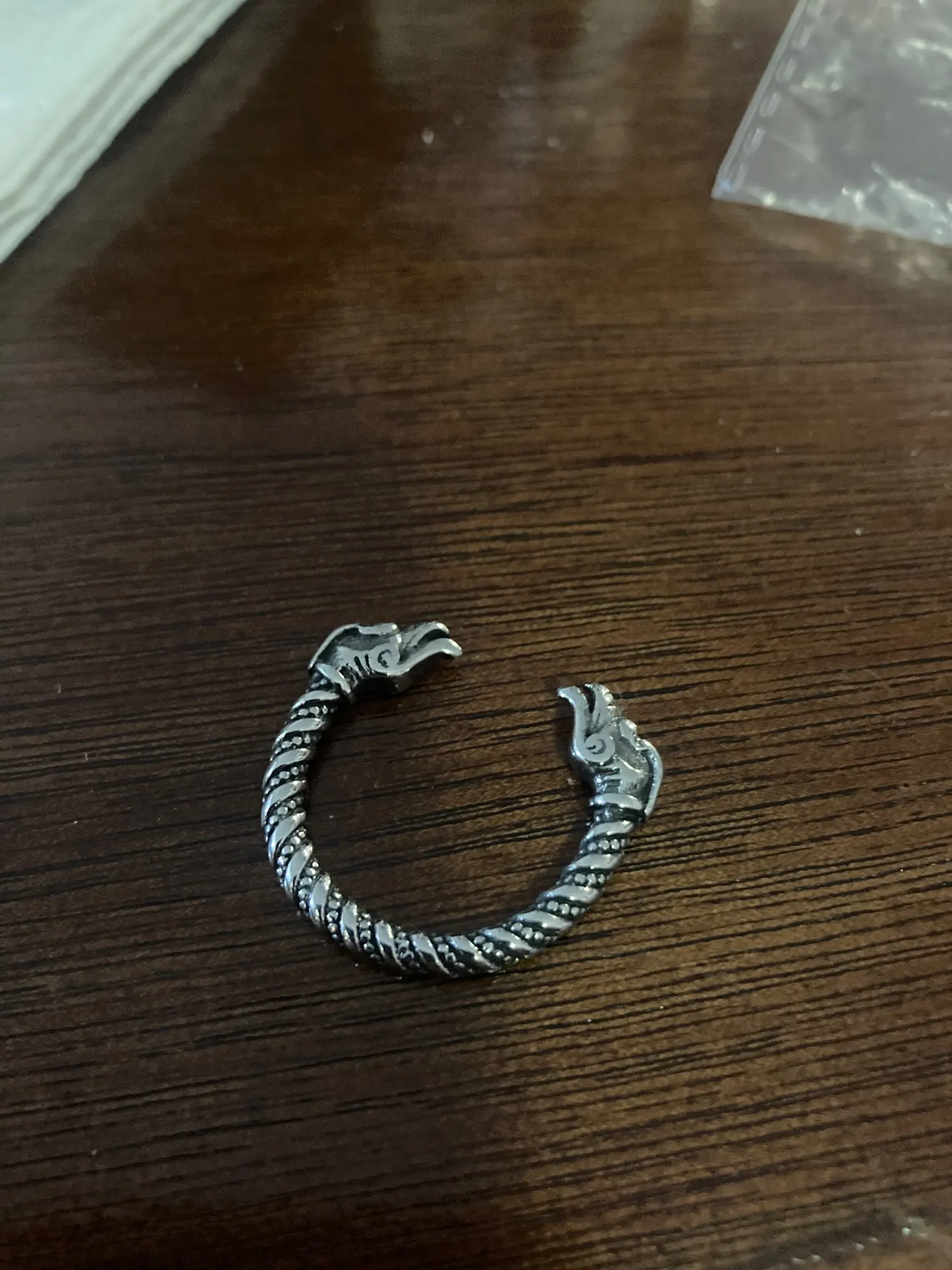 This delicately handmade ring features twisted steel and dragons at the terminals, one of the most prominent icons in Norse mythology.