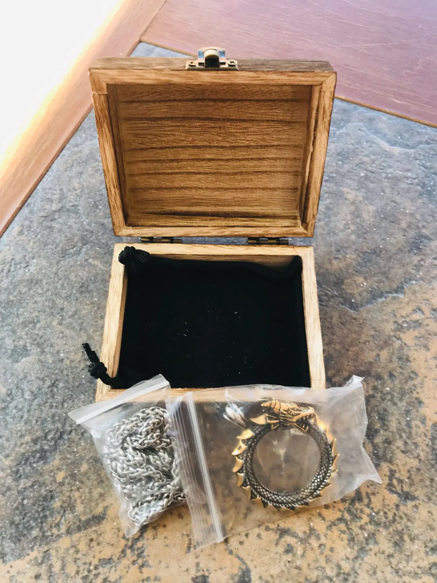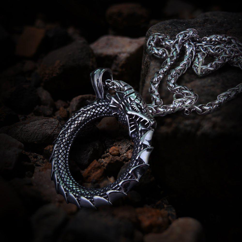 This Jörmungandr Ouroboros Dragon Viking Necklace is forged from durable steel and has a steel chain.