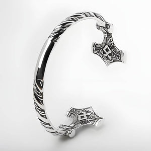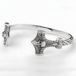 This exceptional handcrafted arm ring features a prominent Mjölnir (Thor's Hammer), meticulously crafted from premium sterling silver. Each piece is individually made by master artisans, showcasing intricate Norse detailing and superior craftsmanship. This substantial Viking bracelet embodies the legendary power of Thor's hammer, serving as both a striking statement piece and a protective talisman.