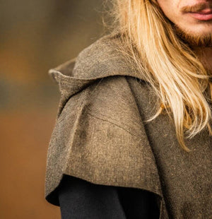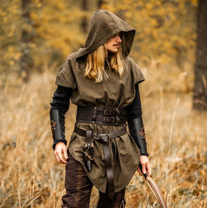 This green period tunic is designed for comfort and mobility. With short sleeves and a deep V-neck, it keeps you cool during long days at the fair or on the trail. The rounded hood provides added coverage when needed, without hindering your movement.