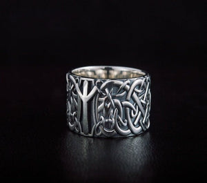 Norse Ornament Ring with Algiz Rune Sterling Silver Jewelry