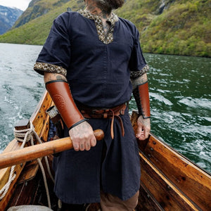 Embodies the essence of fierce Norse warriors, with its intricate detailing and rugged design. Crafted from high-quality cotton with short sleeves and elaborate embroidery, it offers durability, comfort, and traditional Viking style. Perfect for reenactments, LARP events, or anyone seeking a historically-inspired garment.
