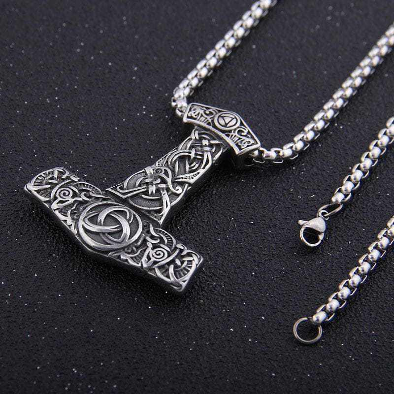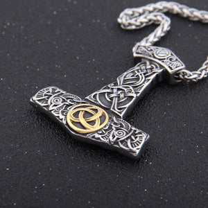 This Thor's Hammer Necklace made in steel has a steel chain and Mjolnir pendant. It can feature either silver or gold knotwork and will transform your Viking look.