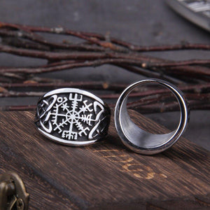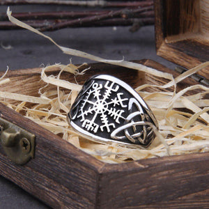 This Vegvisir Viking Compass Ring with Bold Knotwork comes is forged from steel and can be styled with a gold or steel Vegvisir insignia.