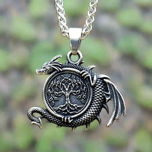 The pendant's weight gives it presence without dragging. Stainless steel means you can wear it in rain, snow, or while working up a sweat at the faire. The dragon's scales catch light differently depending on the angle. Tree branches reach toward the serpent's coils in eternal conflict.
