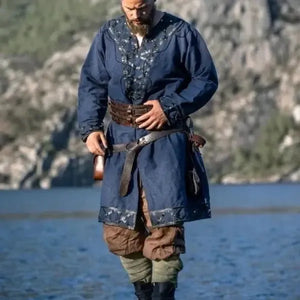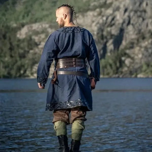This Limited Edition Blue Viking Lord Tunic captures the essence of a noble Viking leader, displaying prestige and power. Crafted from durable cotton and enhanced with genuine leather trim and rivets, it displays both power and historical authenticity. Its long sleeves offer warmth and protection, making it perfect for reenactments, LARP events, or for those who seek a unique garment steeped in Viking style.