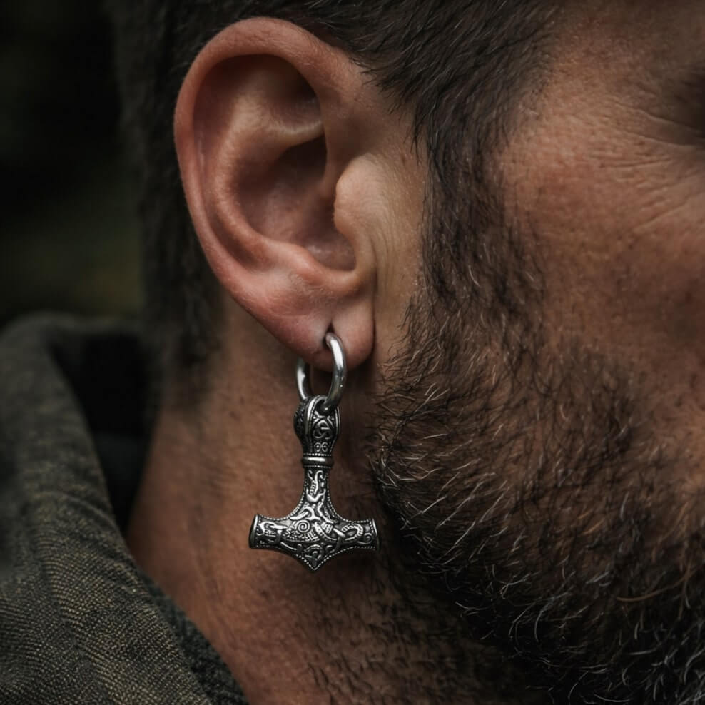 The hammer pendant measures 1 inch in length. It catches light and draws attention without weighing down your ears. The knotwork patterns tell stories of ancient Norse craftsmanship. These aren't costume jewelry. They're built to last through festivals, concerts, and daily life.