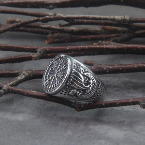 This Viking Reaver Vegvisir and Drakkar Signet Ring is forged from steel with an elaborately detailed talisman.