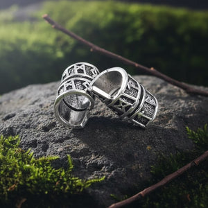 Thread these metal beads into your hair or beard. Ten pieces with carved rune patterns. Vikings marked their braids with beads like these to show status and skill in battle. Made from durable metal alloy in antique silver and gold finishes. Each bead features geometric Norse patterns that catch the light. Slide them onto thin braids, loc sections, or beard hair. They stay put once twisted into place.