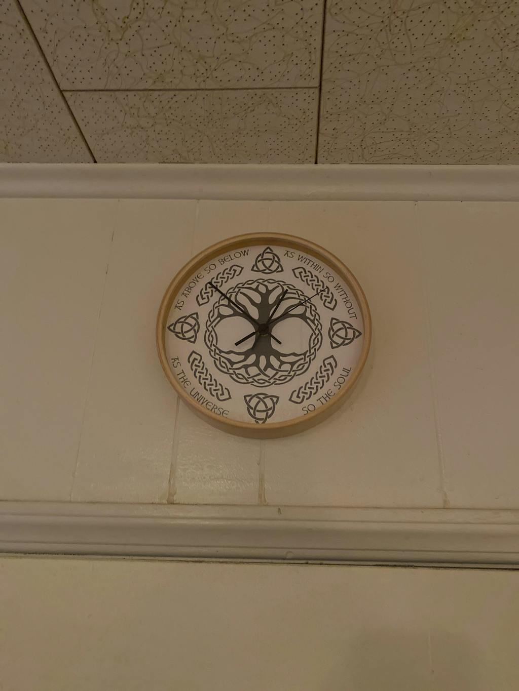 This wall clock displays Yggdrasil, the Norse Tree of Life that connects all nine worlds. The great ash tree held Asgard, Midgard, and seven other realms among its branches and roots. A silent mechanism keeps time without disturbing your space. Wooden frame with plexiglass face. Pre-installed hook makes mounting easy.